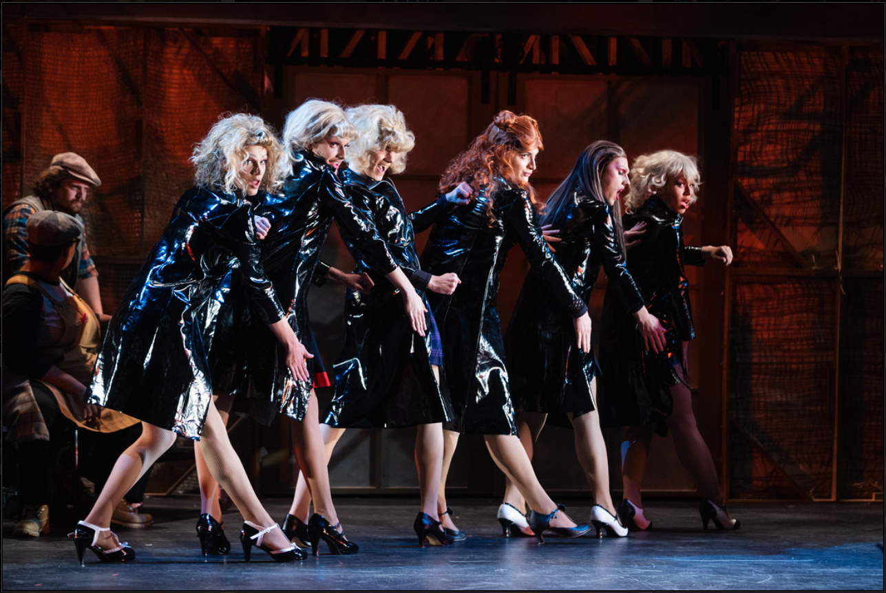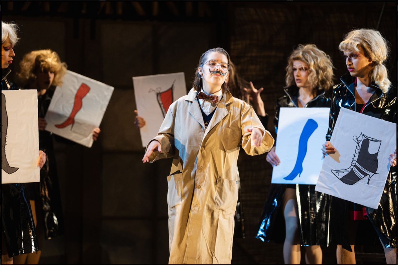 Double casting and quick changes were big challenges in this production. Some actors started the show playing male-presenting characters and needed to get into drag quickly offstage. Additionally, most of the ensemble played multiple characters which required lots of wig and costume changes.